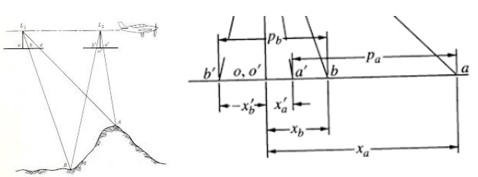 The above figure determine the images of object at points A and B; is considered as the part of the overlapping area within the two successive imagery vertical aerial images taken from the camera at the position in the space. Camera focus on point parallel to the flight line In the side image they appear as a’ and b’. Point A movement is greater because it occurs at higher position than that of the point B. The stereoscopic parallax at A and B are parallax a(Pa) and parallax b(Pb).
